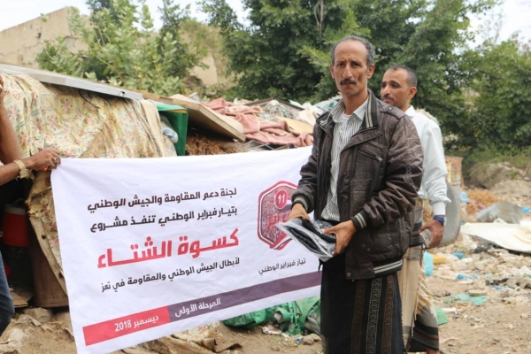 دشنت لجنة دعم المقاومة والجيش الوطني، بتيار فبراير الوطني، بمحافظة تعز، صباح اليوم، مشروع "كسوة الشتاء" لأبطال الجيش الوطني والمقاومة في المدينة.