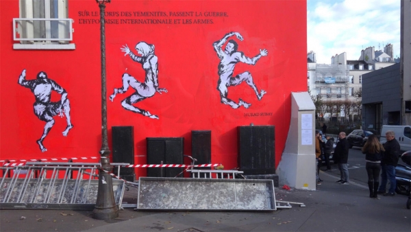صدمت جدارية تظهر ثلاث جثث على خلفية حمراء المارة في وسط باريس يوم الثلاثاء بعد أن كشف فنان يمني النقاب عن تلك الجدارية للتنديد بصفقات الأسلحة الفرنسية إلى التحالف الذي تقوده السعودية في بلاده.