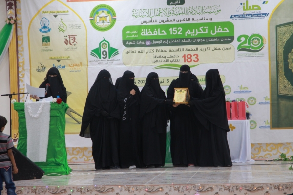 احتفت اليوم السبت، مؤسسة البادية للتنمية والأعمال الإنسانية بوادي حضرموت، تكريم 152 حافظة لكتاب الله تعالى، منهن حافظتان مجازتان بالسند المتصل إلى الرسول صلى الله عليه وسلم برواية شُعبة.