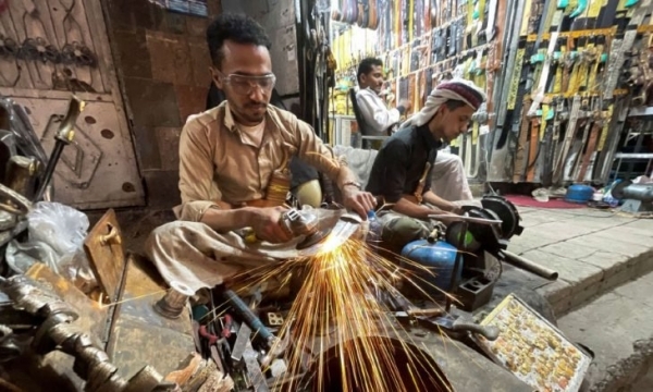 في ورشة صغيرة في العاصمة اليمنية صنعاء، يمكن رؤية شرر يتطاير بينما يقوم عمال بشحذ نصول قصيرة تُستخدم في صنع الخناجر التقليدية اليمنية المعروفة باسم جنابي، ومفردها جنبية.