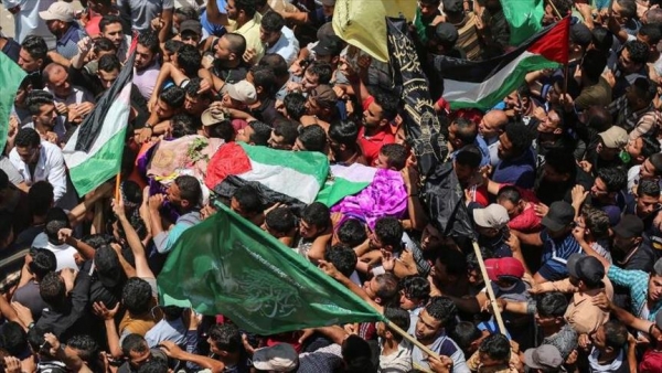 وبعد الصلاة على الشهيدة في مسجد عباد الرحمن المجاور لمنزلها، انطلق موكب الجنازة محمولا على الأكتاف تجاه مقبرة بلدة خزاعة، وسط هتافات وصيحات غضب، ومطالبات "بالثأر من الاحتلال لدمائها".