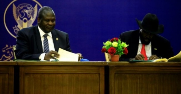 وأفاد مراسل وكالة فرانس برس الذي حضر مراسم التوقيع الأحد أن كير وخصمه رياك مشار وقعا في السودان المجاور الاتفاق الذي سيعود زعيم التمرد بموجبه إلى حكومة الوحدة الوطنية كنائب أول للرئيس بين خمسة في هذا المنصب.