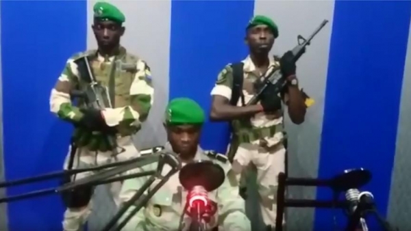 وفجر الإثنين، وعلى الساعة 4:30 بالتوقيت المحلي (05:30 ت.غ)، تلى الملازم كيلي أوندو أوبيانغ، بيانا باسم جماعة أطلقت على نفسها "الحركة الوطنية لقوات الدفاع والأمن في الغابون"، قال فيها إن "الكلمة التي ألقاها الرئيس علي بونغو، في رأس السنة، تعزز الشكوك في مدى قدرته على مواصلة أداء مهام منصبه".