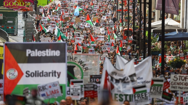 ووفقا لشرطة العاصمة البريطانية، فإن ما يصل إلى 100 ألف متظاهر تجمعوا وسط لندن في مسيرة مؤيدة لفلسطين، ورفع المشاركون لافتات كتب عليها "الحرية لفلسطين" و"أوقفوا قصف غزة".