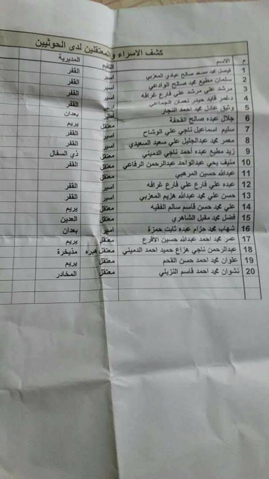 وقد حصل "يمن شباب نت"، على أسماء المختطفين والأسرى المفرج عنهم في صفقة تبادل تمت في الجوف، وفق الكشف المرفق.