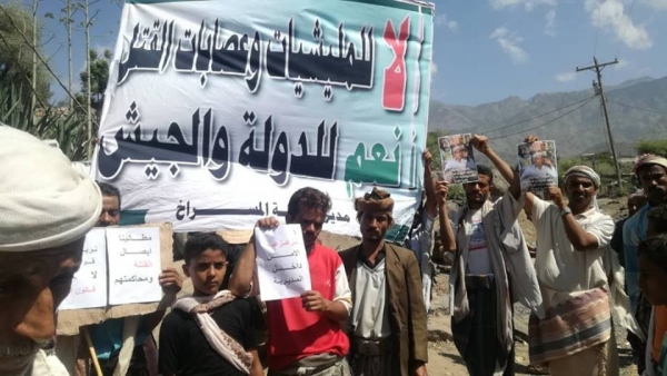 نظم أبناء مديرية المسراخ بمحافظة تعز، صباح اليوم الاثنين، وقفة احتجاجية في منطقة نجد قسيم تنديدا بالعصابات المسلحة والمليشيات القادمة من خارج المديرية.