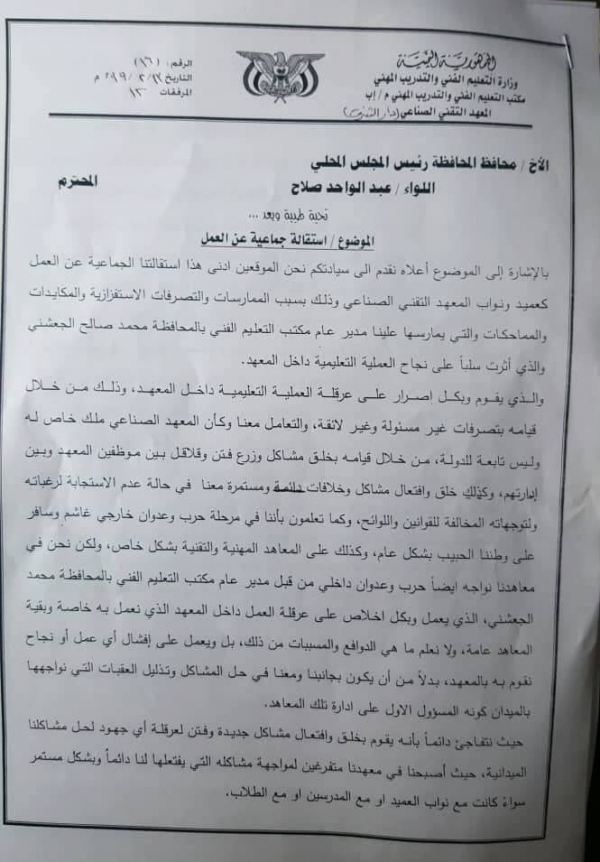 وسبب المستقيلون في رسالة بعثوها إلى محافظ الانقلابيين في المحافظة "عبدالواحد صلاح" وحصل "يمن شباب نت " على نسخة منها، ماسموها تصرفات وعراقيل يقوم بها مدير مكتب التعليم الفني في المحافظة.