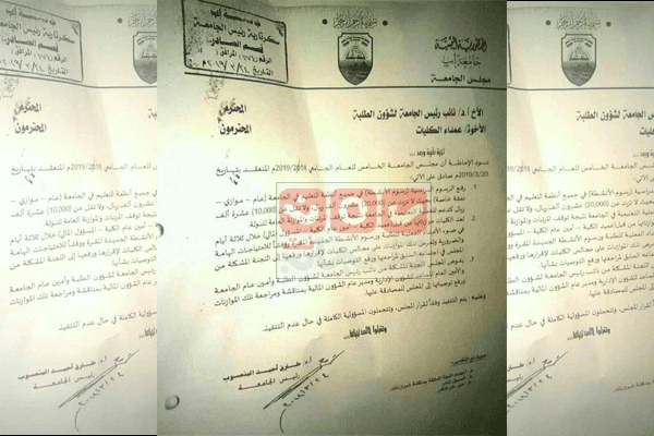 وكانت الجامعة قد أقرت في وقت سابق مناقشة مقترح تحديد مبلغ شهري على كل طالب لدعم خزينة الجامعة لتوفير مرتبات الكادر التعليمي والوظيفي في ظل انقطاع المرتبات.