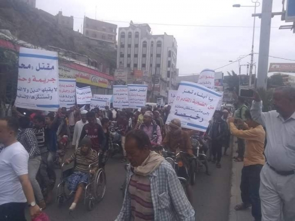 شهدت مدينة تعز، اليوم الاثنين، مسيرة احتجاجية للمطالبة بتسليم قتلة المواطن محمد علي مهدي.