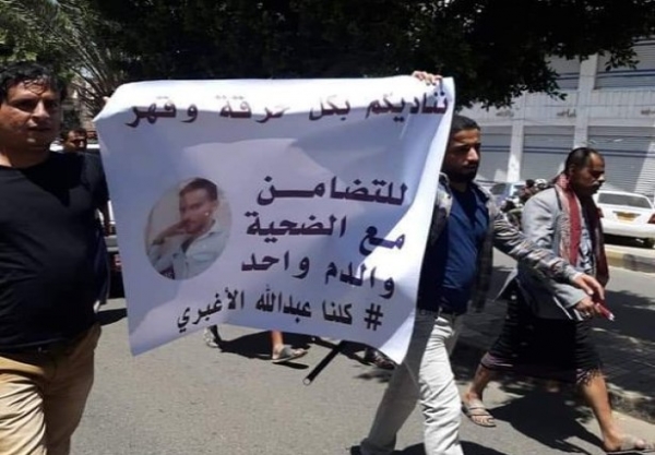 وفي غضون ذلك تظاهر عشرات المواطنين أمس الخميس في العاصمة صنعاء للمطالبة بسرعة القصاص بحق مرتكبي جريمة الشاب "عبد الله الاغبري"، ورفعوا شعارات تضامنية "كلنا عبد الله الاغبري" معبرين عن غضبهم الشديد إزاء الجريمة التي أثارت سخط واسع معتبرين إنها أصبحت "قضية اليمنيين جمعياً.