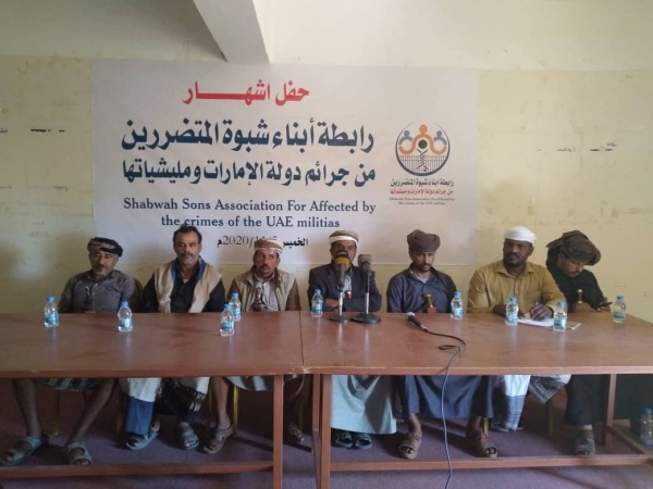 أشهر مواطنون في محافظة شبوة، جنوبي شرق اليمن، اليوم الخميس، رابطة المتضررين من جرائم الإمارات ومليشياتها.