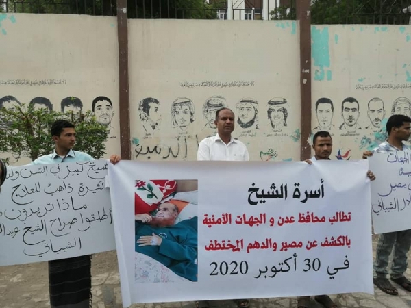 جاء ذلك في وقفة احتجاجية، نفذتها أسرة الشيباني مع ناشطين، أمام مبنى محافظة عدن، جنوبي اليمن.