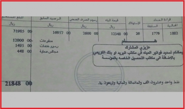 وقال سكان محليون، إن مؤسسة المياه التابعة لمليشيا الحوثي في المحافظة رفعت تعرفة الوحدة الماء لشهر مايو المنصرم من 220 ريال إلى 475 ريال، إضافة إلى زيادة في الرسوم الأخرى المتمثلة بالصرف الصحي والمجالس المحلية والخدمات التي تضفيها المليشيا على الفاتورة.