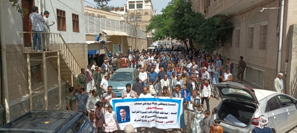 وطالب المحتجون بالإفراج عن مدير الشركتين عدنان الحرازي المخطوف في سجون الحوثة منذ يناير الماضي دون أن توجه له أي تهمة.