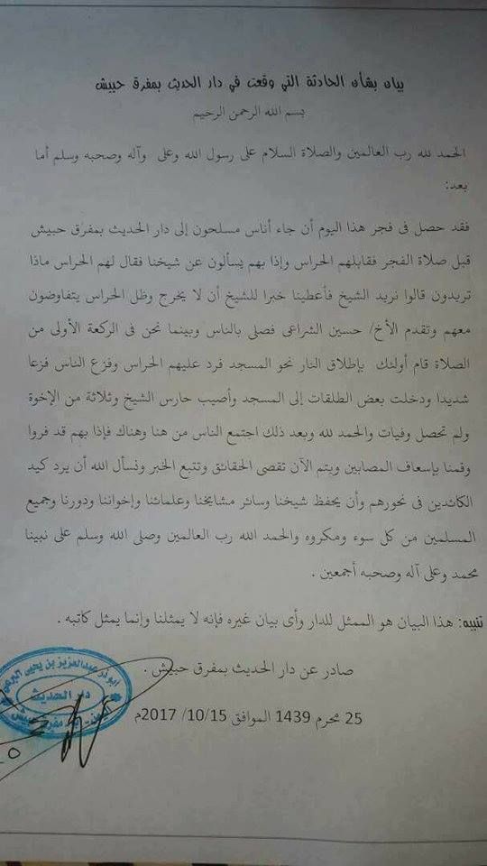 البيان قال بأن مجموعة من المسلحين قدموا إلى الدار قبل صلاة الفجر، وسألوا عن الشيخ بهدف تصفيته، فتم ابلاغهم بأن الشيخ غير موجود، وحين بدأ الناس في الصلاة باشر المسلحين إطلاق النار عليهم، ظناً بأن الشيخ متواجد ، فأصيب حارس شخصي وثلاثة آخرين تم إسعافهم إلى أحد المستشفيات لتلقي العلاج.