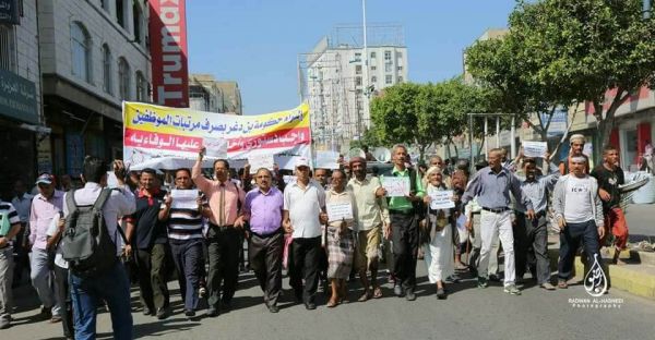 تظاهر العشرات من الموظفين في مدينة تعز،اليوم الاثنين،للمطالبة بصرف مرتباتهم المتوقفة منذ أكثر من عام.