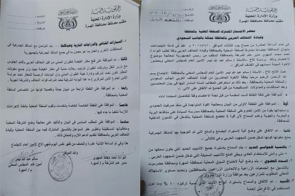 أبرمت السلطات في محافظة المهرة اتفاق مع القوات السعودية المتواجدة بالمحافظة، يقضي بالاستجابة للمطالب الستة للمعتصمين.