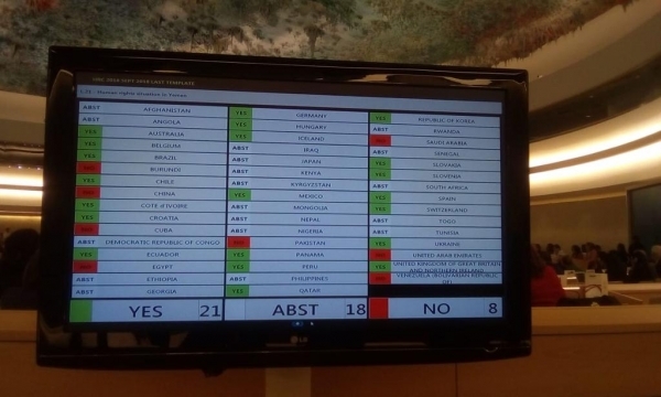 صوّت مجلس حقوق الإنسان، التابع للأمم المتحدة، بواقع 21 صوتاً مقابل ثمانية أصوات؛ لصالح تمديد مهمة التحقيق في انتهاكات حقوق الإنسان في اليمن، وذلك رغم الاعتراضات من جانب الحكومة اليمنية المعترف بها دولياً والتحالف الذي تقوده السعودية.