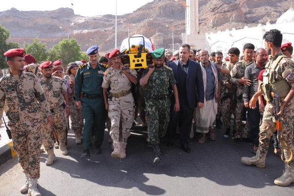 شيّع اليوم الإثنين جثمان رئيس هيئة الاستخبارات والاستطلاع اللواء الركن محمد صالح طماح، الذي توفي، أمس الأحد، متأثراً بإصابته التي تعرض لها في الحادثة الإجرامية التي استهدفت قاعدة العند الجوية العسكرية، ونفذتها ميليشيا الحوثي الانقلابية الإيرانية باستخدام طائرة مسيّرة.