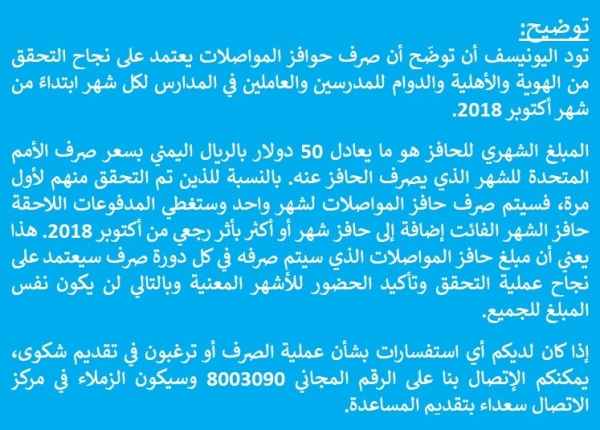 وكانت منظمة اليونيسيف، قد أعلنت في يناير الماضي، بدء عملية صرف الحوافز النقدية للمعلمين، والكادر المدرسي في اليمن، ابتداء من الخميس 28 فبراير 2019، والمحددة بمبلغ 50 دولار للشهر الواحد.