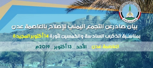 هنأ التجمع اليمني للإصلاح فرع عدن، وعموم الشعب اليمني، بحلول الذكرى السادسة والخمسين لثورة 14 أكتوبر، معرباً عن اعتزازه بمدينة عدن التي كانت محضن ثورة أكتوبر ومهد انطلاقتها.