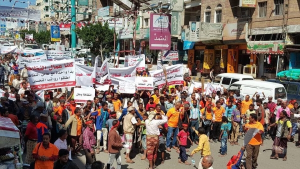 تظاهر المئات من أبناء مدينة تعز، اليوم الخميس، احتجاجاً على انقطاع رواتب عُمال النظافة منذ نحو خمسة أشهر.