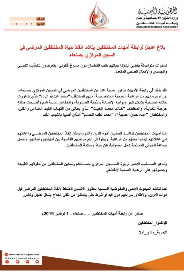 وطالبت المبعوث الأممي إلى اليمن، والمفوضية السامية لحقوق الإنسان واللجنة الدولية للصليب الأحمر بالضغط على جماعة الحوثي، لإنقاذ المختطفين المرضى وإعادتهم إلى عائلاتهم لينالوا حظهم من الرعاية، ويبقوا في أيام مرضهم القاسية بين أمهاتهم وأبنائهم.