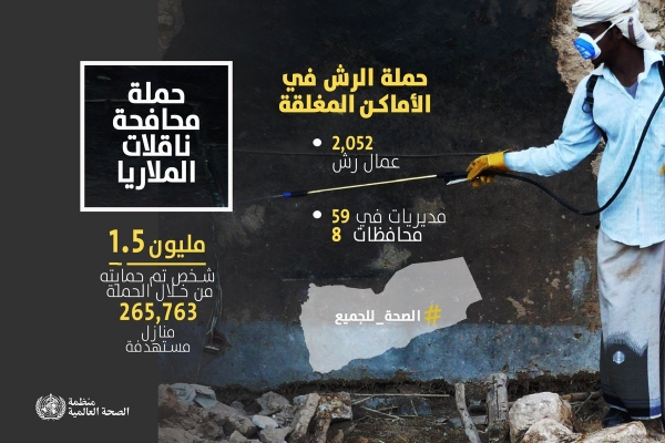 ودشنت المنظمة خلال الأسابيع الماضية، حملة رش لمكافحة البعوض الناقل للملاريا والحميات الفيروسية في 59 مديرية بـ 8 محافظات يمنية.