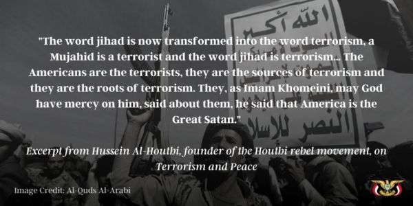 وجماعة الحوثي، جماعة شيعية انطلقت من صعدة، شمالي اليمن، توالي إيران وتعتنق فكرها ومذهبها الديني، وتعمد على تقسيم الشعب اليمني على أسس طبقية وطائفية، وتوسع نفوذها في اليمن بعد انقلابها على السلطة في سبتمبر 2014م بدعم من الرئيس اليمني السابق علي عبدالله صالح، وسيطرتها على معظم المدن اليمنية.