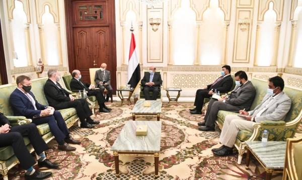 وثمن المبعوث اليوت برامز والسفير كريستوفر هنزل، جهود الرئيس في تصوراته للأوضاع وجهوده الحميدة نحو السلام وكذلك ما يتصل بوحدة الجهود لمواجهة التحديات الإيرانية من خلال التسريع الايجابي لتنفيذ اتفاق الرياض.