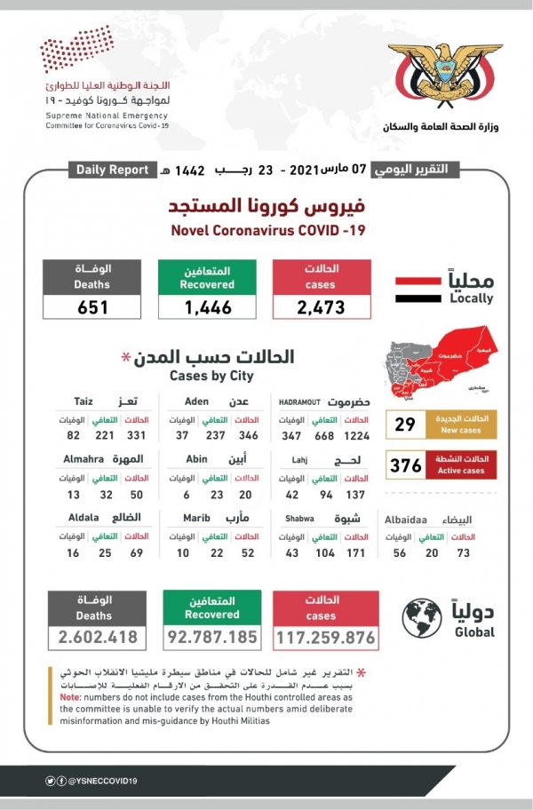 وأوضحت اللجنة إرتفاع إجمالي الحالات المؤكد إصابتها إلى (2473) حالة، منها (651) وفاة و(1446) حالة تعافٍ.