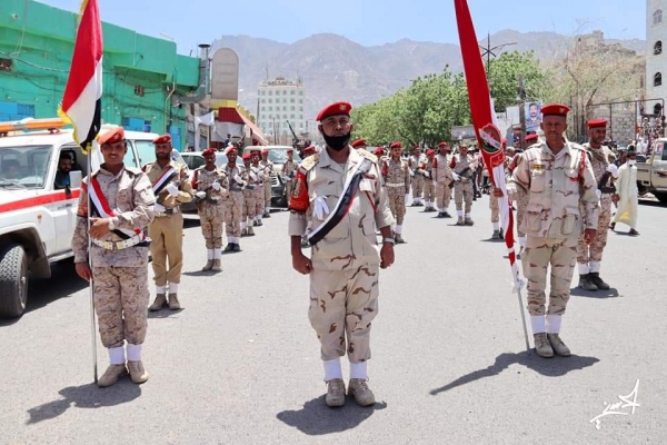 وتقدم الحشود كل من قائد محور تعز، قائد اللواء 145 مشاة، اللواء الركن خالد قاسم فاضل، وقائد محور طور الباحة، قائد اللواء الرابع مشاة جبلي اللواء أبوبكر الجبولي، وعدد من القيادات العسكرية والأمنية والمدنية.