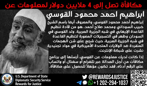وفي تغريدة على الحساب الرسمي لبرنامج "مكافآت من اجل العدالة" التابع لوزارة الخارجية الأمريكية، قالت "ترك هذا الارهابي بلده السودان ليتلقى الأوامر من قيادة القاعدة في إيران ليعيث خرابا في اليمن وأهله".