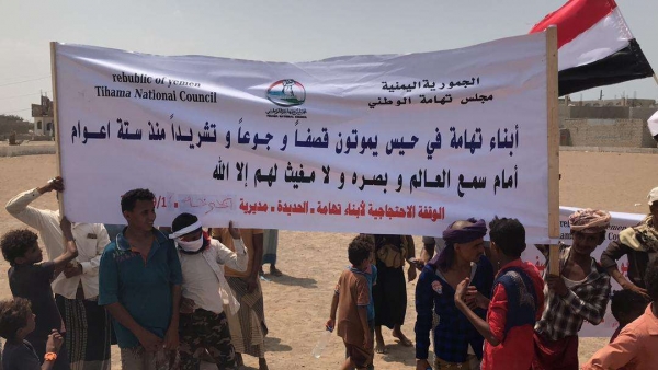 نظم مجلس تهامة الوطني، الخميس، وقفة احتجاجية في مدينة الخوخة جنوب محافظة الحديدة (غربي اليمن) تنديدًا بجرائم ميليشيات الحوثي.