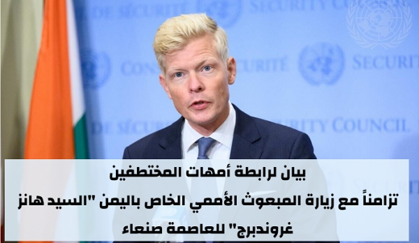 دعت رابطة أمهات المختطفين، الأربعاء، المبعوث الأممي هانس غروندبرغ، الذي يزور صنعاء حالياً، إلى الضغط على جميع الأطراف لإطلاق سراح جميع المختطفين.