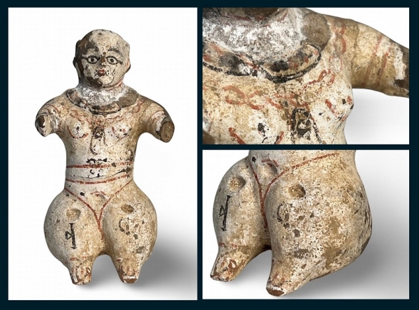 وأوضح أن المجسم "لشخصية يمنية قديمة نادرة وفريدة من نوعها تعبر عن الخصوبة، ذات ملامح وجه مرسومة بدقة، ويفصل الجسم الأمامي وجها آخر منمقا حول البطن، وتشكل لفات دهون البطن فما كبيرا، يوجد أيضا شقان على شكل دائري أعلى الساقين وواحد حول أسفل البطن"، وهو أحد تحف المجموعة الخاصة بالسيد جي باهاموند، جامع آثار بريطاني، درس علم آثار الشرق الأدنى القديم وبريطانيا الرومانية في جامعة مانشستر.