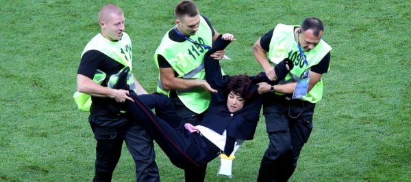 تعطَّلت المباراة النهائية في كأس العالم لدقائق، بعدما تمكَّن 4 متسلّلين تابعين لفرقة Pussy Riot (المناهضة للكرملين) من الدخول إلى أرض ملعب «لوجنيكي» في العاصمة الروسية موسكو، قبل تدخُّل الأمن وإخراجهم.