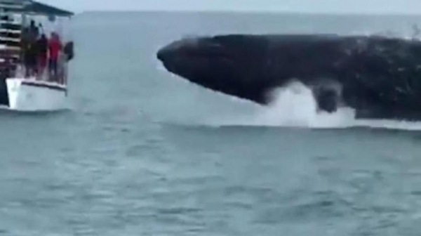 وبحسب صحيفة «ذا صن»، فقد أظهرت لقطات فيديو الحوت يقفز بعنف في مياه البحر.