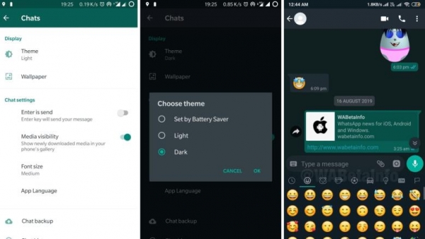 يمكن لمستخدمي "أندرويد 10" و"آي أو إس 13" استخدام ميزة الوضع المعتم من خلال تفعيلها في إعدادات النظام، حيث سيجدون داخل إعدادات الدردشة خاصية (إظهار الوسائط) والتي بسحبها ستظهر خيارات هذا الوضع ووضع توفير البطارية بالإضافة إلى الوضع العادي بالإضاءة المعتادة.