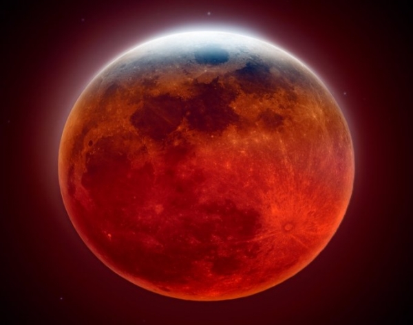 ويبدو القمر ضاربا إلى الحمرة لأن الغلاف الجوي للأرض يمتص الألوان الأخرى بينما ينحني بعض ضوء الشمس نحو القمر. وإن انحناء ضوء الشمس عبر الغلاف الجوي وامتصاص الألوان الأخرى هو أيضا سبب لكون غروب الشمس الذي نراه هنا على الأرض غالبا يتسم باللونين البرتقالي والأحمر.