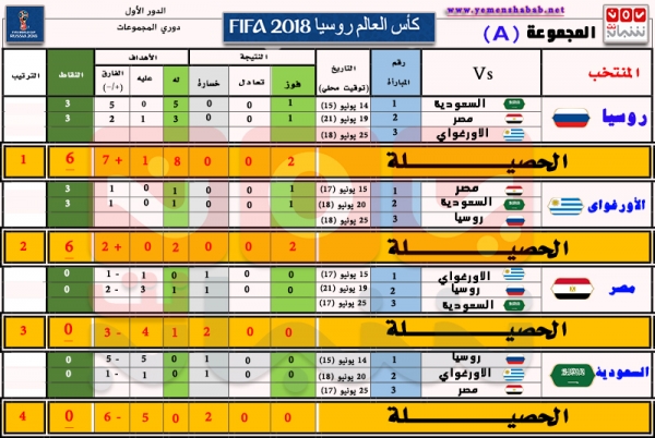 وتقام لقاءات المجموعة الأولى الساعة الخامسة بالتوقيت المحلي لليمن. حيث تلتقي روسيا (متصدرة المجموعة)، مع الأورغواي. فيما سيجمع اللقاء الثاني كل من السعودية ومصر.