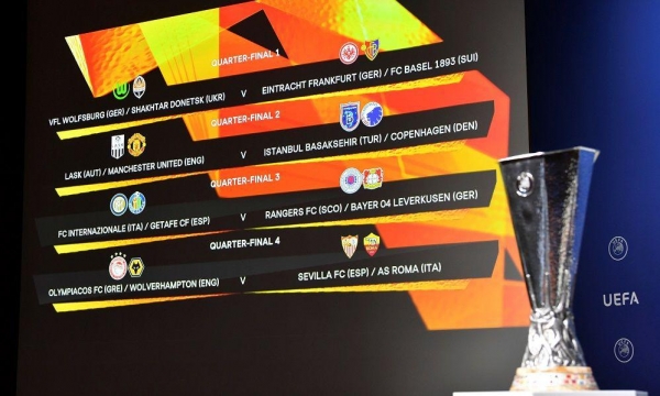 4. المتأهل من مواجهة ثمن النهائي بين أولمبياكوس اليوناني وولفرهامبتون الإنكليزي مع المتأهل من لقاء إشبيليه الإسباني وروما الإيطالي "لم يخوضا جولة الذهاب في ثمن النهائي وسيلعبان مباراة واحدة فقط" .