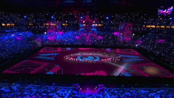 وشهد الحفل حضور جماهيري لافت إذ امتلأت مدرجات استاد البيت المونديالي بالجماهير التي حملت المشاعل والأضواء مما زاد من جمالية الاحتفال، وما أشعل المدرجات بالحماسة وزاد البهجة فيها أنه تم استعراض عدد من الأغاني العربية الشهيرة والتي عبرت عن جميع الأقطار العربية المختلفة.
